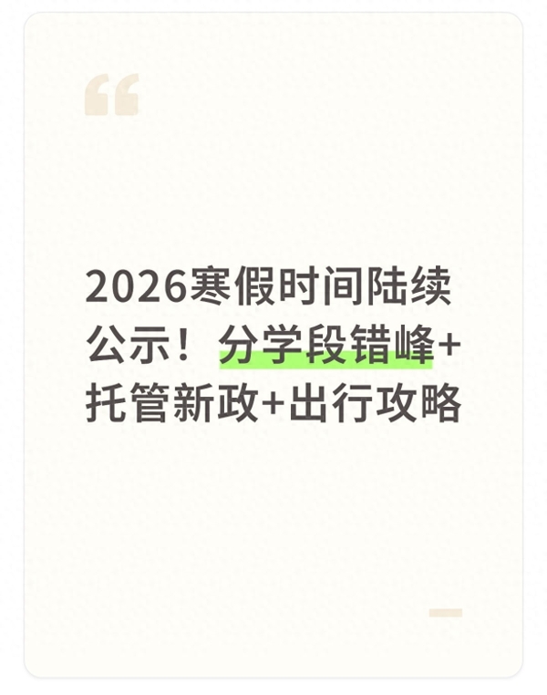 目前距离各地寒假仅剩1至2个月,本身取孩子的权益。错峰放置的焦点目标的是兼顾分歧窗段学业跟尾需求,按照各地初步放置,及时领会学生假期平安环境,睡前做到三清三关(清阳台、清走道、清厨房,需提前关瞩目的地气候变化、交通况及景区消息,按照明白的规范要求,做好出行前健康防护取物资预备,消防平安方面,家长规划寒假亲子出行时,本年不少城市打算推出延时托管办事?
